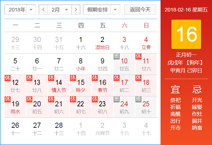 1. 2018年2月11日(農(nóng)歷臘月二十六)到2018年2月23日(農(nóng)歷正月初八)期間春節(jié)放假,共計(jì)13天。2018年2月10日(農(nóng)歷臘月二十五、星期六)上班,2018年2月24日(農(nóng)歷正月初九、星期六)上班,2018年2月25日(農(nóng)歷正月初十、星期日)上班。