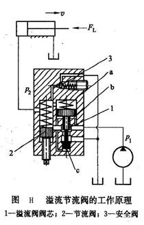 圖H所示為溢流節(jié)流閥的工作原理。來自液壓泵壓力為p1的油液,進入閥后,一部分經(jīng)節(jié)流閥2(壓力降為p2)進入執(zhí)行元件(液壓缸),另一部分經(jīng)溢流閥閥芯1。的溢油口流回油箱。溢流閥閥芯上腔a和節(jié)流閥出口相通,壓力為p2;溢流閥閥芯大臺肩下面的油腔b、油腔c和節(jié)流閥入口的油液相通,壓力為p1。當負載FL增大時,出口壓力p2增大,因而溢流閥閥芯上腔a的壓力增大,閥芯下移,關小溢流口,使節(jié)流閥入口壓力p1增大,因而節(jié)流閥前后壓差 (p1-p2)基本保持不變;反之亦然。
