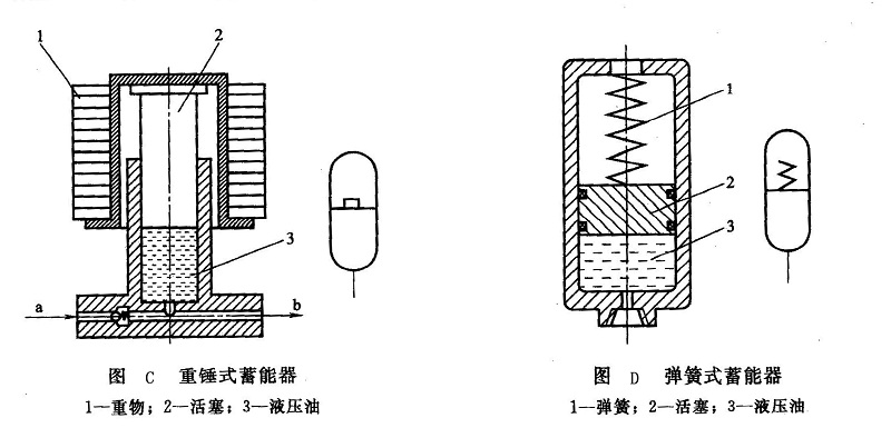 重錘式蓄能器的結(jié)構(gòu)如圖C所示。它是利用重物的位置變化來儲存和釋放能量的。重物 1通過活塞2作用于液壓油3上,使之產(chǎn)生壓力。當(dāng)要儲存能量時(shí),油液從孔a經(jīng)單向閥進(jìn)入蓄能器內(nèi),通過柱塞推動(dòng)重物上升;釋放能量時(shí),柱塞同重物一起下降,油液從b孔輸出。