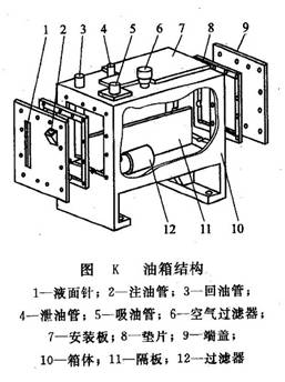 開式油箱的典型結(jié)構(gòu)如圖K所示。隔板11將吸油管5和回油管3、泄油管4隔開。頂部、側(cè)部及底部分別裝有空氣過(guò)濾器6、注油管2、液面針1以及過(guò)濾器12。安裝液壓泵及其驅(qū)動(dòng)電動(dòng)機(jī)的安裝板7可固定在油箱的頂面上。油箱的箱體10通常用2.5~5mm鋼板焊接而成。