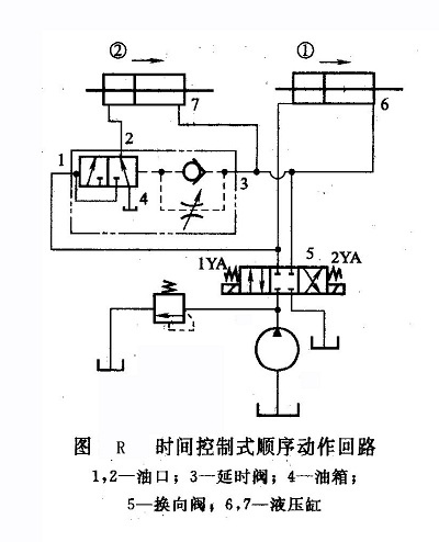 時間控制式就是在一個液壓缸開始動作后,經(jīng)過一段規(guī)定的時間,另一個液壓缸動作的控制方式。在液壓系統(tǒng)中,時間的控制一般是由延時閥來完成的。