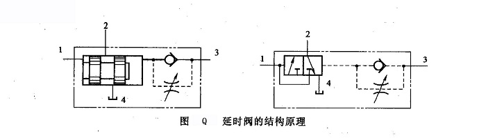 圖Q所示為延時閥的結(jié)構(gòu)原理。它由單向節(jié)流閥和二位三通液動換向閥組成。當(dāng)油口1通人壓力油時,閥芯向右運(yùn)動,將其右端油腔中的油液經(jīng)節(jié)流閥排出后,油口1、2才能接通。故油口1和2是延時接通的。調(diào)節(jié)節(jié)流閥開口的大小,就改變了油口1和2延時接通的時間。