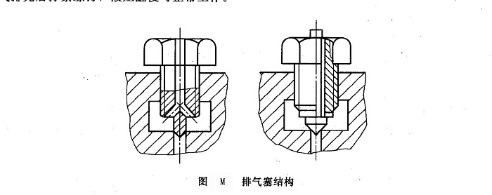 對(duì)于要求不高的液壓缸,往往不設(shè)專門的排氣裝置,而是將油口布置在缸體兩端的最高處,由流出的液壓油將缸中的空氣帶走;對(duì)于速度穩(wěn)定性要求較高的液壓缸和大型液壓缸,常在液壓缸的最高處設(shè)置專門的排氣裝置,如排氣塞、排氣閥等。圖M所示為排氣塞,當(dāng)松開(kāi)排氣塞螺釘時(shí),讓液壓缸全行程空載往復(fù)運(yùn)動(dòng)若干次,帶有氣泡的油液就會(huì)排出,空氣排完后擰緊螺釘,液壓缸便可正常工作。
