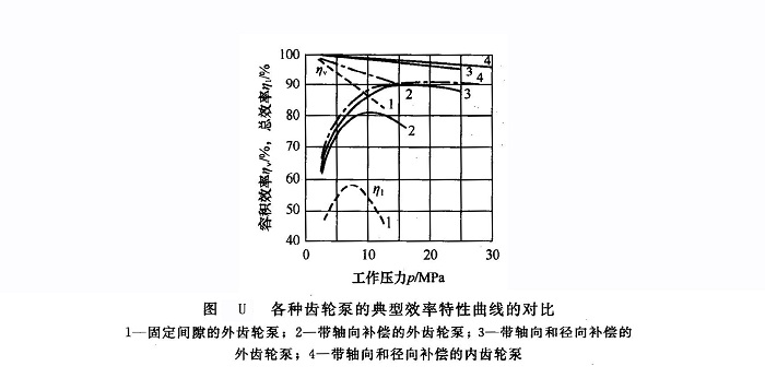 (4)效率各種結(jié)構(gòu)形式的齒輪泵的典型效率特性曲線如圖U所示。可以看出,帶有間隙補(bǔ)償措施的齒輪泵的性能明顯優(yōu)于固定間隙型,而內(nèi)嚙合齒輪泵的性能又優(yōu)于外嚙合齒輪泵。