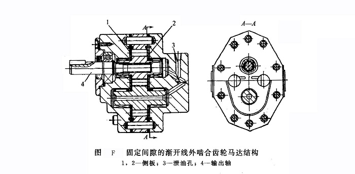 ①固定間隙的漸開線外嚙合齒輪馬達 圖F所示為固定間隙的漸開線外嚙合齒輪馬達結(jié)構(gòu)。齒輪兩側(cè)的側(cè)板用優(yōu)質(zhì)碳素鋼08F表面燒結(jié)0.5~0.7mm厚的磷青銅制成。該側(cè)板只起耐磨作用,沒有端面間隙補償作用。采用固定間隙可以減小摩擦轉(zhuǎn)矩,改善啟動性能,但容積效率較低。國產(chǎn)CM-F型齒輪馬達即為此種結(jié)構(gòu),其額定壓力為14MPa,排量為11~40mL/r,轉(zhuǎn)矩為20~70N·m,轉(zhuǎn)速為1900~2400r/min。