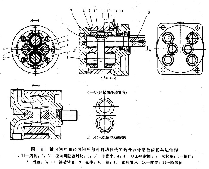 ③軸向間隙和徑向間隙都可自動補償?shù)臐u開線外嚙合齒輪馬達圖H和圖I所示為軸向間隙和徑向間隙都可自動補償?shù)凝X輪馬達結(jié)構(gòu)及齒輪受力情況。該馬達的殼體9用無縫鋼管制成,齒輪1及11的齒頂與殼體不接觸,而直接暴露在高壓油中,只在低壓區(qū)附近一個小范圍內(nèi)(兩個齒)與徑向間隙密封塊接觸,徑向間隙密封塊可對徑向間隙進行自動補償,當(dāng)馬達反向旋轉(zhuǎn)時,徑向間隙密封塊起著相同的作用。馬達的浮動軸套8和12(兼作滾針軸承座),可作軸向間隙的壓力補償。O形密封圈的作用是從軸向?qū)⒌蛪簠^(qū)限制在一個很小的范圍內(nèi),同時也限制了軸套背面的受壓面,達到軸套的壓力平衡。當(dāng)馬達反向旋轉(zhuǎn)時O形密封圈起著相同的作用。