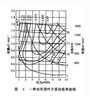 (4)效率 單作用定量葉片泵在額定工況下的容積效率可達92%;雙作用定量葉片泵在額定工況下的容積效率可超過94%,均略低于齒輪泵,但葉片泵的機械效率一般較高。故兩者的總效率相差無幾。圖X 所示為一種雙作用葉片泵的效率曲線。