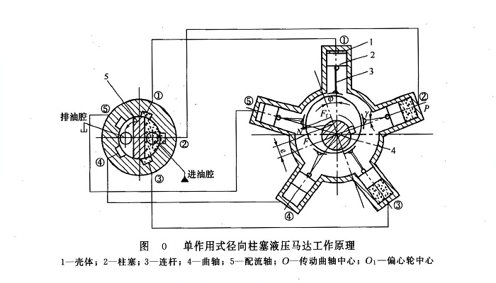 (1)單作用式徑向柱塞馬達(dá)的工作原理 如圖O所示,曲軸連桿式徑向柱塞馬達(dá)沿殼體1的圓周放射狀均勻布置了五個(gè)(或七個(gè))缸,缸中的柱塞2通過球鉸與連桿3相連接,連桿端部與曲軸4的偏心輪(偏心輪的圓心為O1,曲軸旋轉(zhuǎn)中心為O,兩者的偏心距為e)相接觸,曲軸的一端為輸出軸,另一端則通過十字聯(lián)軸器與配流軸5連接。配流軸上“隔墻”兩側(cè)分別為進(jìn)油腔和排油腔。