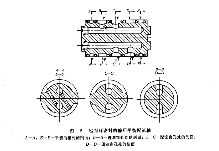 ③配流副 圖O所示馬達(dá)為軸配流。由于配流軸的一側(cè)為高壓腔,另一側(cè)為低壓腔,故配流軸工作過程受到很大的徑向力,此徑向力將配流軸推向一側(cè),而使另一側(cè)間隙加大,造成滑動(dòng)表面的磨損和泄漏量的增加,致使效率下降。為此,常采取開設(shè)對(duì)稱平衡油槽的措施以平衡徑向力。如圖P所示為采用密封環(huán)密封的靜壓平衡配流軸,正中的C-C窗孔是配流窗孔,B-B和D-D上的環(huán)形槽分別是進(jìn)油和回油窗孔,A-A和E-E是靜壓平衡半圓環(huán)形槽。假定各密封環(huán)分別放置在密封帶的正中。若進(jìn)、出油方向如圖P中箭頭所示,各孔標(biāo)有符號(hào)P的都是高壓腔,標(biāo)有符號(hào)T的都是低壓腔。可見, B-B和D-D圓周方向的壓力都相同,沒有徑向力產(chǎn)生;C-C窗孔剖面的上腔與進(jìn)油口相通,是高壓側(cè),下腔與回油口相通,是低壓側(cè),因此使配流軸受到很大的徑向力。為了平衡這個(gè)徑向力,在配流軸兩端設(shè)置半圓環(huán)形平衡油槽A-A和E-E,使其上腔通高壓油,為了減小泄漏,各腔之間設(shè)有密封環(huán)。為了保證上、下兩側(cè)靜壓平衡,配油窗口和平衡油槽的相關(guān)尺寸應(yīng)滿足如下關(guān)系式: