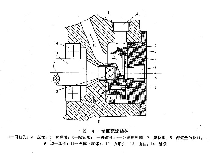 圖Q所示為曲軸連桿液壓馬達(dá)的端面配流結(jié)構(gòu)。曲軸13通過方形頭12帶動(dòng)配流盤4與壓盤2同步旋轉(zhuǎn),轉(zhuǎn)動(dòng)中實(shí)現(xiàn)配流。啟動(dòng)或空載運(yùn)轉(zhuǎn)時(shí)靠片彈簧(碟形彈簧)3使配流盤和壓盤貼緊缸體11與端蓋,設(shè)計(jì)時(shí)保證貼緊力大于配流盤與缸體間的分離力,工作時(shí)由液壓實(shí)現(xiàn)貼緊。但這一結(jié)構(gòu)因分離力與貼緊力不重合而使配流盤存在傾側(cè)力矩。通過采用靜壓平衡結(jié)構(gòu)設(shè)計(jì),可使端面配流副實(shí)現(xiàn)理論上完全平衡。