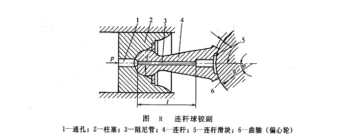 ④連桿副 除了配流副外,曲軸連桿液壓馬達(dá)的性能在很大程度上取決于連桿運(yùn)動(dòng)副。連桿球鉸副的典型結(jié)構(gòu)如圖R所示。它由連桿4的球頭與柱塞2的球窩,連桿滑塊5的底部與曲軸(偏心輪)6兩對(duì)摩擦副組成。連桿滑塊底部與曲軸(偏心輪)間早期為金屬接觸,滑塊底部澆鑄耐磨合金,以減小摩擦力。有的馬達(dá)曲軸(偏心輪)上裝有滾子軸承,用滾動(dòng)摩擦替代滑塊底部與偏心輪間的滑動(dòng)摩擦;目前多數(shù)馬達(dá)在該處設(shè)計(jì)成靜壓平衡或靜壓支承。滑塊底部設(shè)置油室,壓力油通過連桿中心阻尼器進(jìn)入底部油室。工作中滑塊不浮起,油室中液體壓力平衡大部分柱塞推力,并使摩擦副得到良好潤滑。