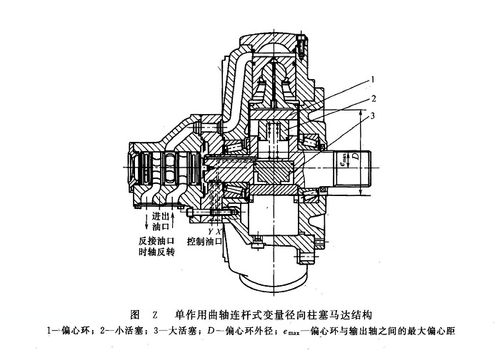b.單作用曲軸連桿式變量徑向柱塞馬達(dá) 圖Z所示為該馬達(dá)結(jié)構(gòu)。通過改變偏心距使馬達(dá)變量。在曲軸上裝有小活塞2和大活塞3。當(dāng)小活塞腔通入控制油、大活塞腔通回油時,小活塞在壓力油的作用下向上運動將偏心環(huán)1推至最大偏心位置,此時馬達(dá)排量和輸出轉(zhuǎn)矩最大,轉(zhuǎn)速最低。若通過換向閥改變位置,使大活塞腔通入控制油、小活塞腔通回油時,大活塞在壓力油的作用下向下運動將偏心環(huán)推至最小偏心位置,此時馬達(dá)為小排量,在供油量相同的情況下,輸出轉(zhuǎn)速提高,而輸出轉(zhuǎn)矩相應(yīng)降低。偏心距的改變可在馬達(dá)運轉(zhuǎn)中平穩(wěn)進(jìn)行;可利用馬達(dá)本身壓力油作控制油,省去了控制油源;這種馬達(dá)可以和定量泵組合構(gòu)成容積調(diào)速回路,有效地實現(xiàn)恒功率調(diào)速。特別適合用于牽引絞車或驅(qū)動車輛的車輪。
