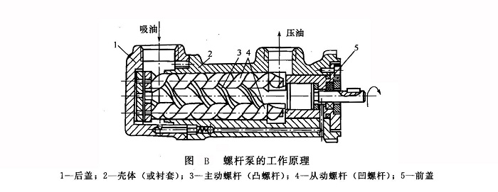 圖B所示為螺桿泵的工作原理,在殼體(或襯套)2中放有三根平行的雙頭螺桿,它們是螺桿泵的核心工作部件。中間的螺桿為兼作傳動軸的凸螺桿3(即主動螺桿),兩邊為兩根凹螺桿4(即從動螺桿)。互相嚙合的三根螺桿與殼體之間形成密封工作容積。每個密封空間的長度約等于螺桿的螺距。殼體左端油口為吸油口,右端油口為壓油口。當(dāng)凸螺桿由原動機(jī)驅(qū)動作順時針方向(從軸頭伸出端看)旋轉(zhuǎn)時,螺桿泵從吸油口吸人液體,并容納于工作容積中,工作容積將沿軸向由螺桿的一端連續(xù)地向另一端移動,故液體也就由吸油口輸送到了壓油口,經(jīng)壓油口壓至液壓系統(tǒng),根據(jù)系統(tǒng)阻力大小建立起相應(yīng)的工作壓力。后續(xù)的螺旋面又不斷形成新的密封容積,隨著原動機(jī)帶動主動螺桿連續(xù)旋轉(zhuǎn),上述過程即會周而復(fù)始地進(jìn)行下去。