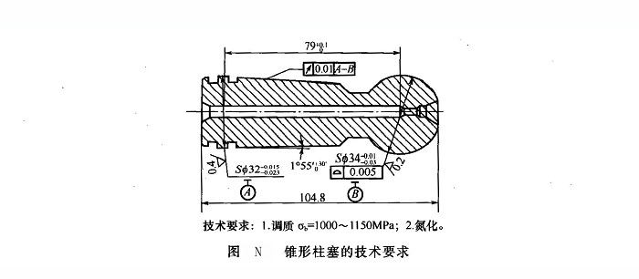 錐形柱塞的加工工藝過程為:下料,鋸切為單件→模鍛成形→調(diào)質(zhì)熱處理→銑兩端面→鉆中心孔→車削成形→粗磨→氮化熱處理→精磨→終驗(yàn)入庫(kù)。