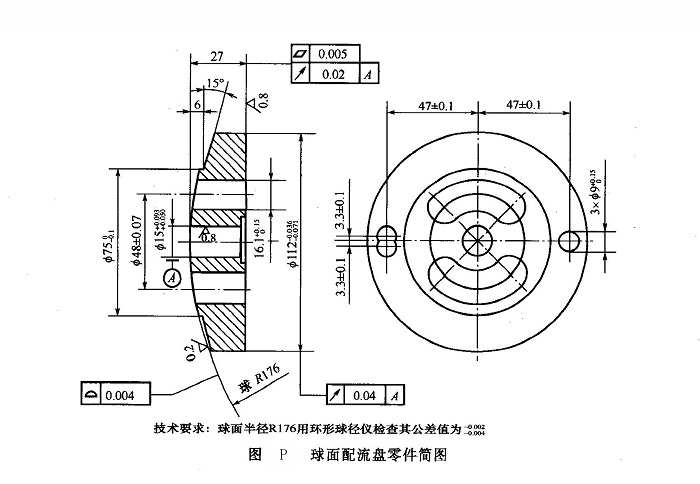 球面配流盤零件簡(jiǎn)圖如圖P所示。球面配流盤的典型加工工藝過程為:調(diào)質(zhì)→粗車兩端面及外圓→半精車外圓,鏜中心孔→精車:仿形車R176球面→鉆腰形槽四孔及定位銷孔→銑腰形槽→粗磨外圓→粗磨端面→粗磨R176球面→集中倒棱、去刺、清洗→氣體氮化→精磨端面→壓人中心襯套→精磨中心孔→精磨R176球面→集中清洗→終驗(yàn)入庫(kù)。