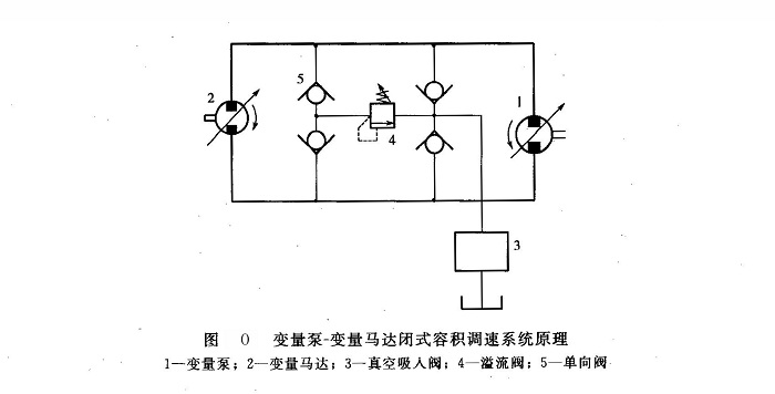 由于原技術(shù)文件中無該液壓裝置的系統(tǒng)原理圖,故經(jīng)仔細分析推斷認為,該液壓變速器實質(zhì)是一個變量泵和變量馬達組成的閉式容積調(diào)速系統(tǒng),根據(jù)推斷試探性繪出液壓原理圖(圖O)。該變速器驅(qū)動功率(即電動機輸入功率)為5kW,其整體尺寸(含油箱)長×寬×高=600mm×200mm×700mm。液壓泵和液壓馬達的變量調(diào)節(jié)機構(gòu)采用絲桿一螺母組成的螺旋副,并分別通過手輪和鏈傳動進行手動和自動調(diào)節(jié);調(diào)壓部分采用6片碟形彈簧組;變速器輸入端與動力源采用柔性連接(液壓泵與驅(qū)動電動機通過兩根V帶傳動)。