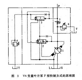 AZ560型注塑機由兩個獨立工作的注塑機和一個搭載16套模具的旋轉工作臺組成。一臺注塑機注鞋面,另一臺注塑機注鞋底。旋轉工作臺每旋轉一周就生產出16雙仿皮靴。注塑機的液壓泵采用力士樂V4變量雙聯葉片泵,其中一個為F型控制方式,另一個為C型控制方式。F型控制方式能進行流量、壓力復合控制,C型控制方式是帶手動壓力調節(jié)的恒壓控制。