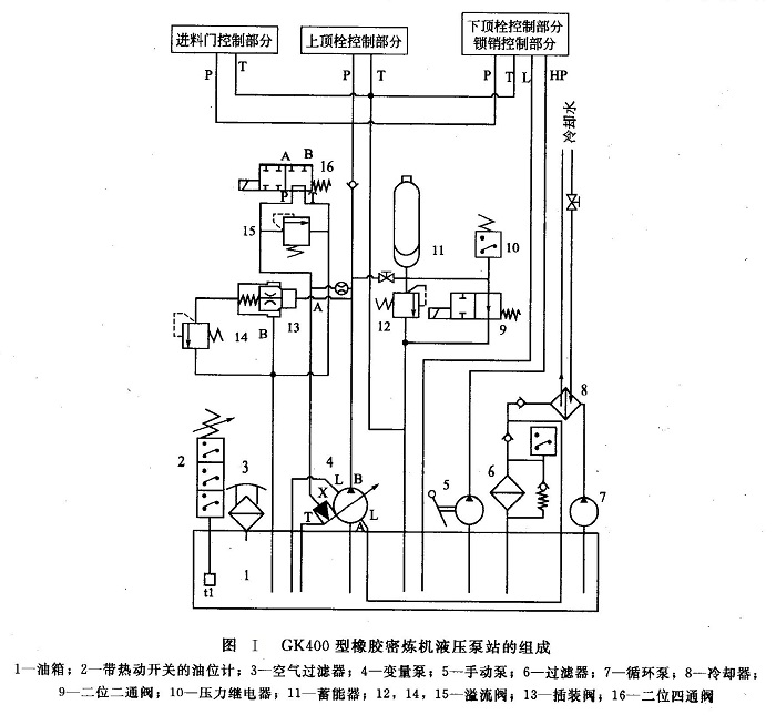 GK400型密煉機液壓系統(tǒng)可大體劃分為液壓泵站部分、上頂栓控制部分、下頂栓及鎖銷控制部分和加料斗控制部分四部分。