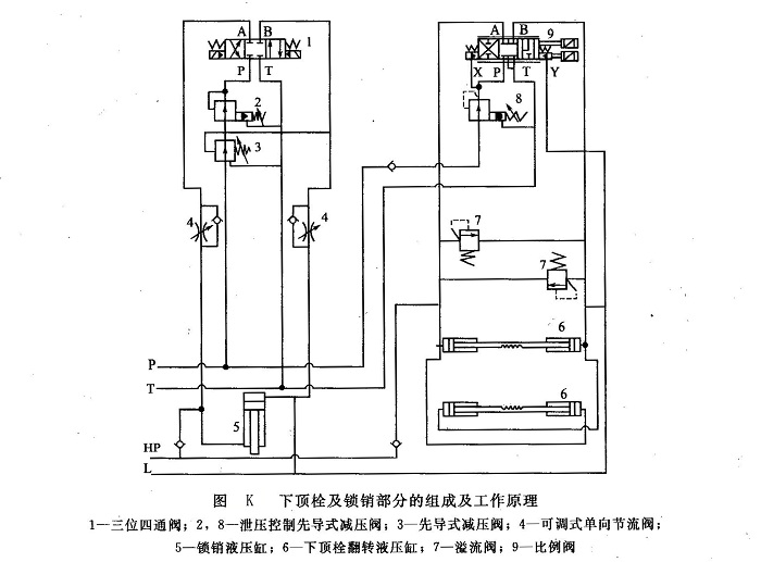 ③下頂栓及鎖銷控制部分的組成及工作原理 下頂栓及鎖銷控制部分的組成及工作原理圖如圖K所示。在下頂栓控制部分中,泄壓控制式減壓閥8控制著下頂栓翻轉(zhuǎn)時液壓缸的壓力;先導(dǎo)式比例閥的換向及開口程度由外部控制板設(shè)定的信號進行比例控制,從而控制著下頂栓的運動速度,防止下頂栓由于運動過快而產(chǎn)生沖擊;溢流閥7主要起保護作用,防止由于過載而損壞下頂栓翻轉(zhuǎn)液壓缸。