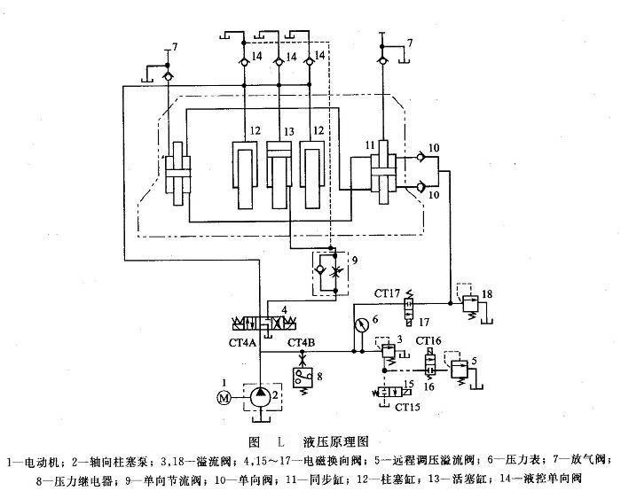 ①壓力繼電器8因本身或控制電路故障未能發(fā)信,CT4B未能通電或損壞,電磁換向閥4閥芯卡滯而不能換向 逐一檢查并排除。