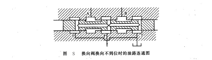 進油腔P通過閥芯中心通道,與兩端回油腔相通,即P-T通,液壓泵卸荷,通往液壓缸的A、B兩油口都封閉。如果換向閥閥芯換向不到位,則可能出現(xiàn)如圖S所示的情況,導致發(fā)生以下故障。