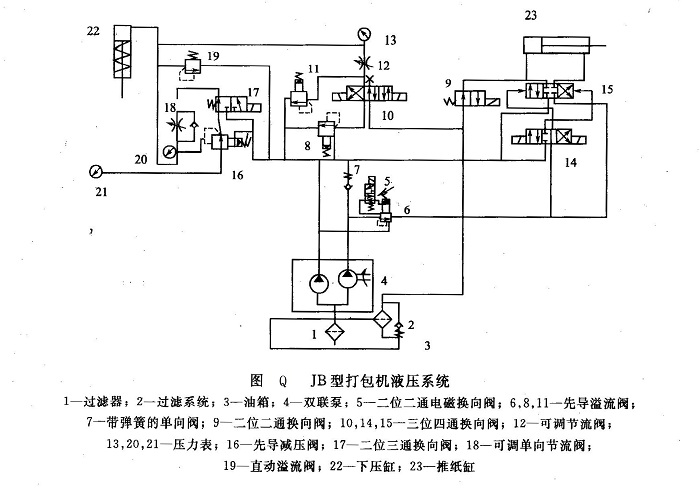 (1) JB型打包機液壓系統(tǒng)簡圖及主要特點