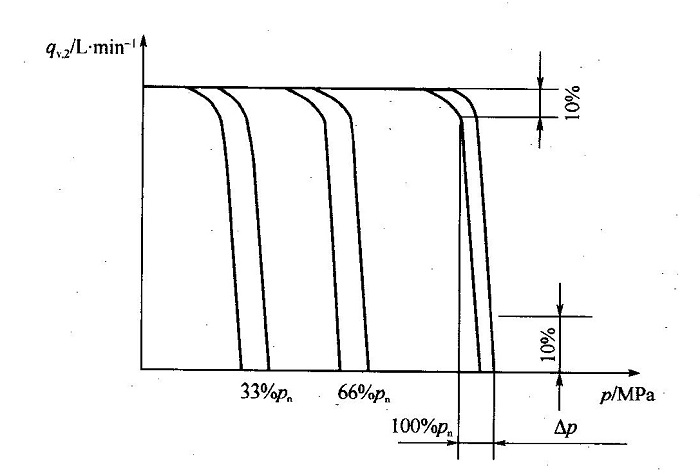恒壓靜特性試驗(yàn):在最大排量、額定轉(zhuǎn)速下加載,繪制不同調(diào)定壓力下的流量一壓力特性鹽線如下圖所示